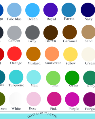 Black, Burgundy, Caramel, Cement, Coffee brown, Cream, Grey, Indigo, Kelly green, Lime Green, Magneta, Merlot, Mint, Mustard, Navy, Ocean blue, Olive Green, Orange, Pale Blue, Parrot Blue, Peacock, Pink, Purple, Red, Rose Ballerine, Royal Blue, Sand, Sunflower, Turquiose, White, Yellow